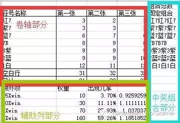中奖类型有3X1、3X3、5X1、5X3,其中3X1和5X1为简单中奖类型,使用之前的两讲的做法就可以很快的计算出来。3X3和5X5这相对复杂一些,因为在一次摇奖中需要对多个组合进行判断。但是今天我们先不讲这个类型的,因为他算是更加进阶的做法了,表格的搭建和之前还是有一些区别的。今天我们主要讲基于简单中奖类型的进阶玩法。