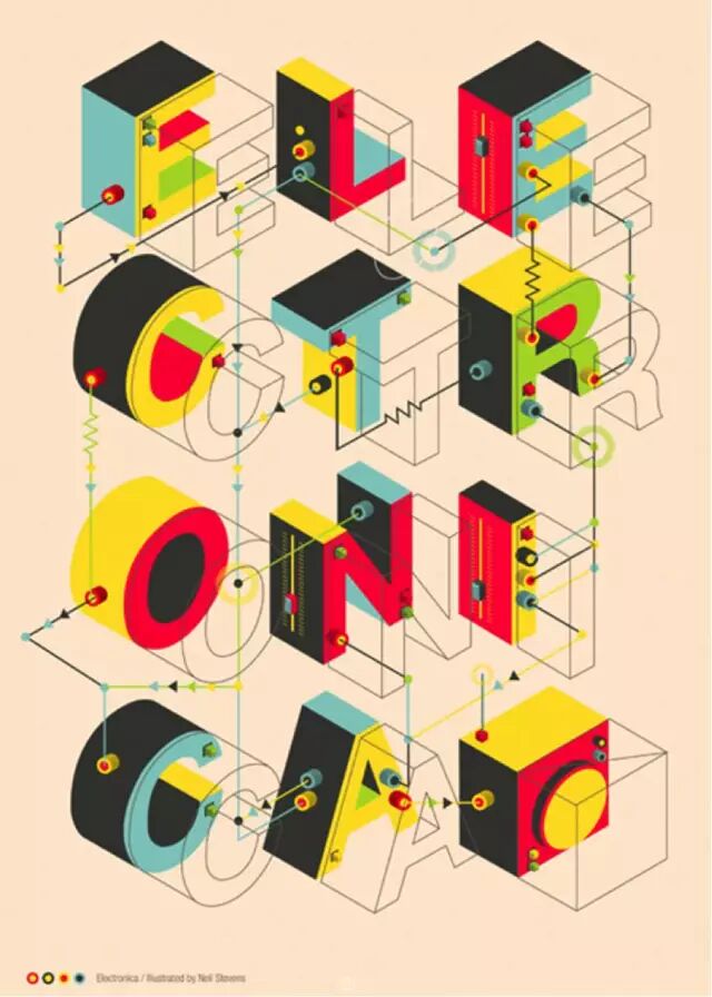 这个电子海报由尼尔史蒂文斯设计,每个字母向右倾斜一点点,给了他们独特的形状和深度。从这种简单的说明、阴影和调整的角度来看,每个元素的设计方式有助于创建一个动态的和引人入胜的效果。