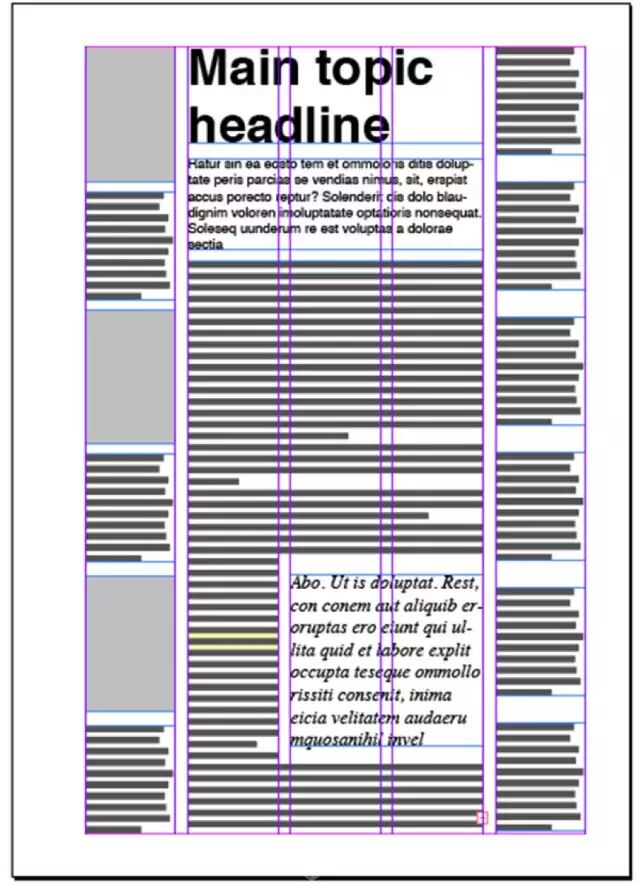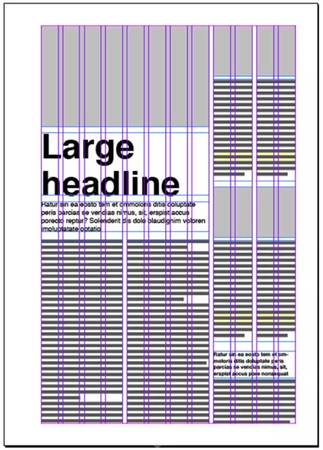 这个例子是一本杂志的原型设计,整体排成了五个竖列,注意看!其中元素是如何包含在其中的,有元素占了三个竖列,也有元素才占两个竖列,但作为一个设计排版,整体还是非常整洁、干净的。