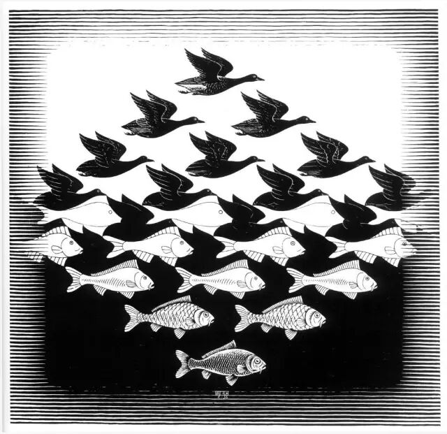 ▲ 看到埃舍尔在空间中用鸟类创造鱼的形状?这是一种消极的工作空间。