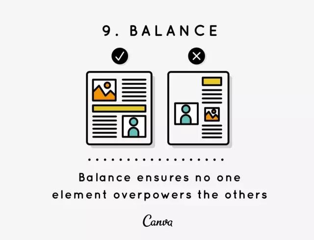 平衡的方法是考虑到每一个元素的“重量”。无论是文本框、图像、块状的颜色,都要考虑他们的大小、形状、和 “重量”。