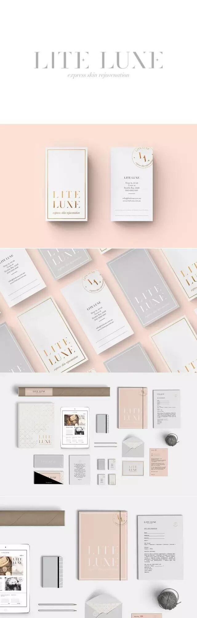 让我们看看下面两个例子。首先,一个女性用品的设计。该设计选择了轻、软以及柔和的色彩。运用白色,浅灰色,粉红的色调和金属色字体,这些选定的颜色相得益彰地创造一个安静、优雅的女性化设计。