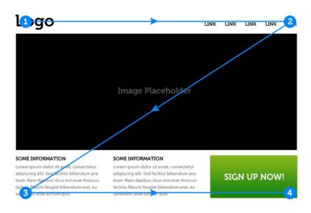 研究证明,眼睛看东西有一个常见的模式,以“E”或“F”的形状看东西,当涉及到网页,把导航栏放在页面的左边或顶部是最好的选择。