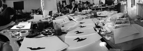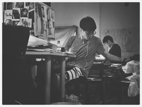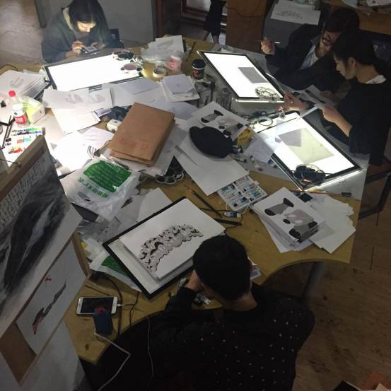 另外就是特别感谢的学妹军团的帮助,在手绘上色方面给了超大的帮助,刚开始是动画系大三对片子感兴趣的学妹在帮我们,后来陶艺系的大腿们强势加盟,因为陶艺系和动画系的上课时间不一样所以空闲的时间都不同,所以我们工作的桌子白天画画的学妹和晚上画画的学妹常常不是同一个专业,大家都超给力的抽时间来上色,在此请收下我和一皓的膝盖。