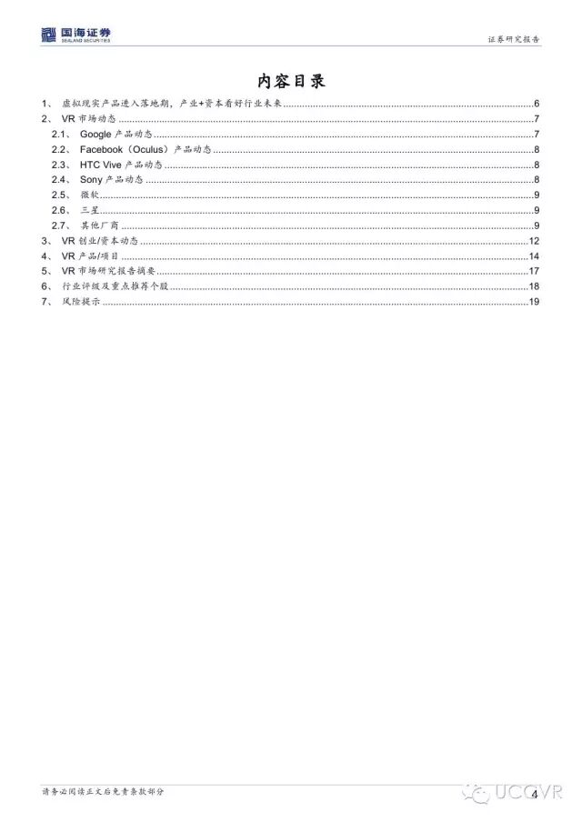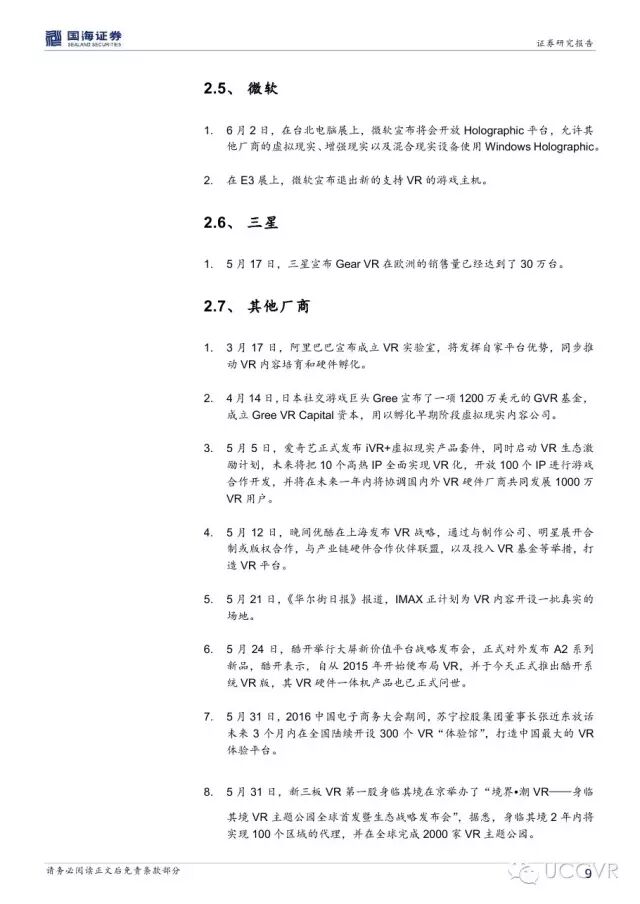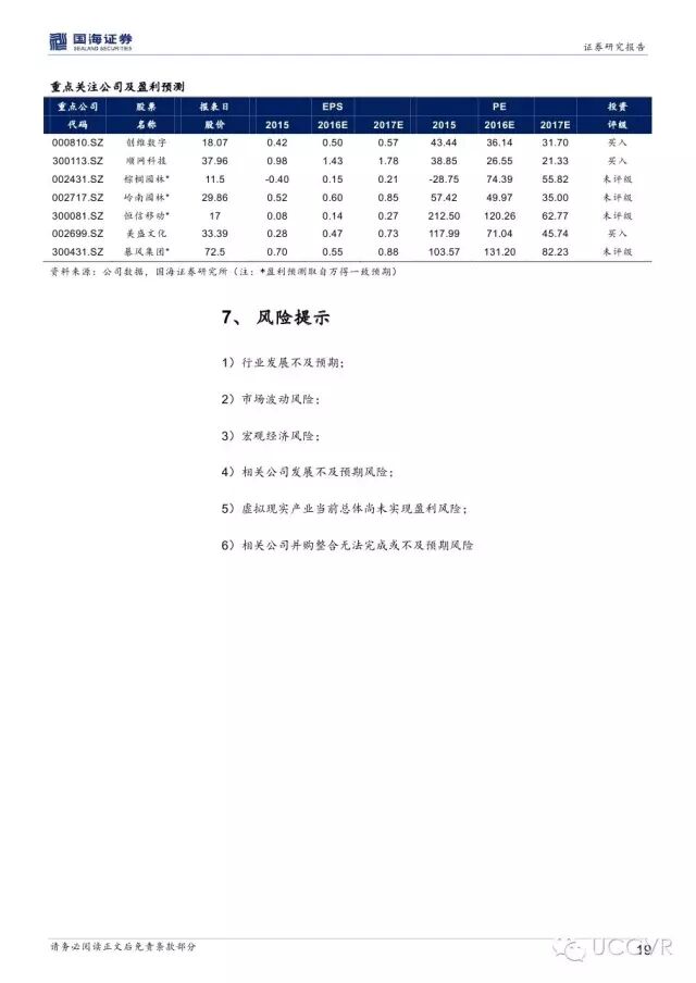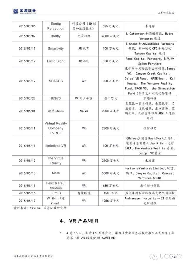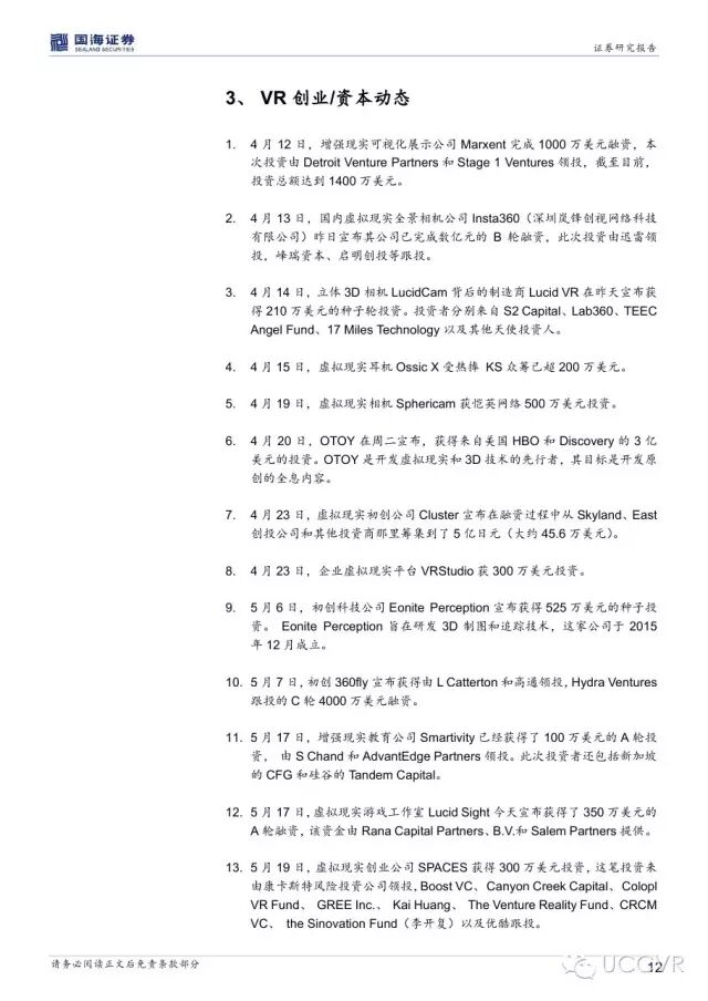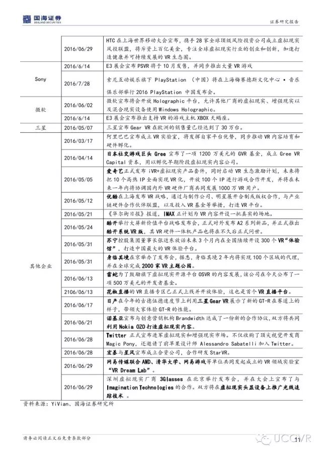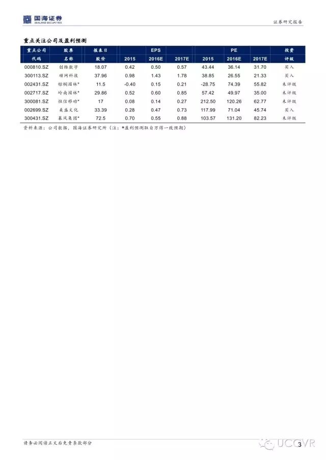 VR 平台: 目前来看, VR 平台类公司均为移动 VR 方向的公司。竞争模式与过去的移动平台的入口之争类似,最终将会存在通用型的平台、手机厂商系平台, VR 的特殊在于与硬件的结合紧密,因此我们认为手机厂商在移动 VR 硬件和平台打造方面均有很大优势。