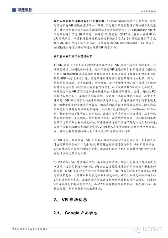 VR 内容: VR 内容同样作为一类泛娱乐的产品,实际上是与传统内容具有竞争关系,均在竞争用户的时间。 VR 内容会发展的逻辑在于可以给用户带来更好的体验,在 VR 渠道和平台竞争白热化的情况下 VR 内容会迎来黄金发展期。