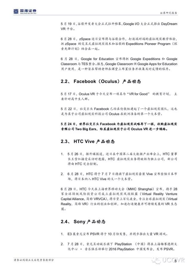 巨头动作频出,坚定看好 VR 未来。 Google、 HTC、 Oculus、 Sony海外虚拟现实领域巨头以及其他相关领域玩家在 VR 领域仍然保持着高密度的产品推出和迭代工作,我们认为,这昭示着 VR 产业不断获得巨头认可,未来应用潜力巨大。 正文中,我们对海外巨头及国内 VR 产业玩家的产业动态做了梳理。