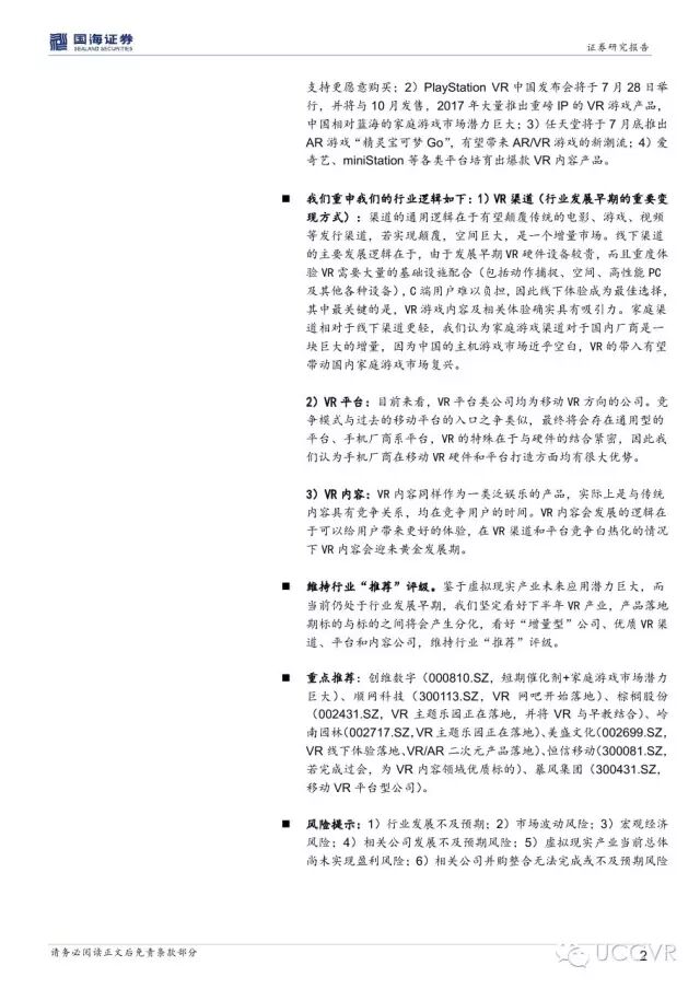 VR 渠道(行业发展早期的重要变现方式): 渠道的通用逻辑在于有望颠覆传统的电影、游戏、视频等发行渠道,若实现颠覆,空间巨大,是一个增量市场。线下渠道的主要发展逻辑在于,由于发展早期 VR 硬件设备较贵,而且重度体验 VR 需要大量的基础设施配合(包括动作捕捉、空间、高性能 PC及其他各种设备), C 端用户难以负担,因此线下体验成为最佳选择,其中最关键的是, VR 游戏内容及相关体验确实具有吸引力。家庭渠道相对于线下渠道更轻, 我们认为家庭游戏渠道对于国内厂商是一块巨大的增量,因为中国的主机游戏市场近乎空白, VR 的带入有望带动国内家庭游戏市场复兴。