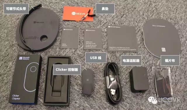 配件包括:HoloLens眼镜、标准Micro-USB 连接线、电源适配器、头带、鼻垫、超细纤维布、快速指南。