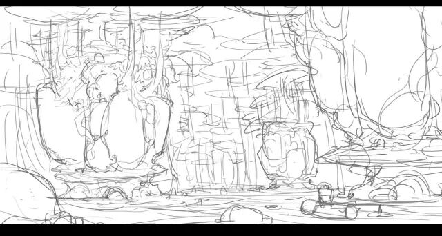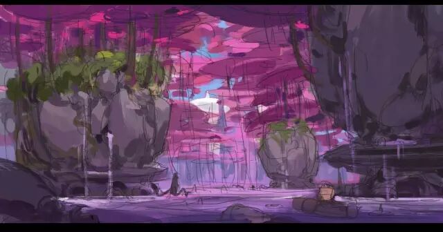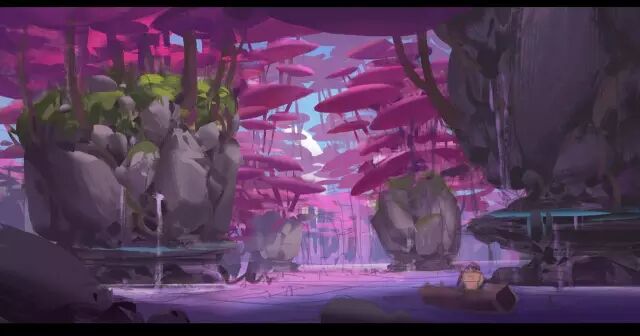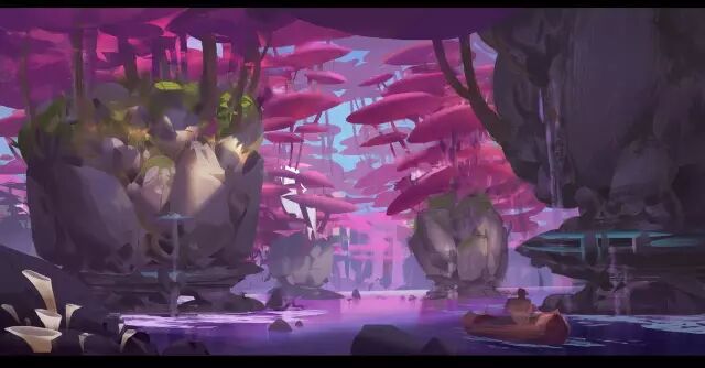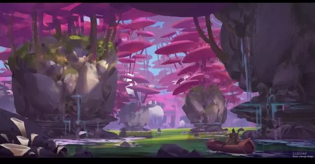 想法:整体画面内容的构建上,想法类似我之前画的《秘境系列》的感觉,是一种新发现的奇遇感,一个人独自来到一个奇特的环境中,环境上选择的是一片水域,水上有巨大的山石和生长的植物,植物很茂密,植物的生长结构类似我们看到的树,枝干方向直挺向上,遮挡住了大部分的天空,树干上生长着类似叶子又似蘑菇但颜色像花一样鲜艳的东西,这样的植物感受虽然在生活中我没见过,但涉及元素是我们可以从生活当中的常识去判断的,一个外来者划着船来到这样的环境。
