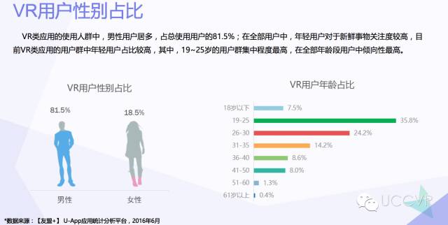 VR类应用的使用人群中,男性用户居多,19~25岁的年轻用户对VR类应用倾向性最高;