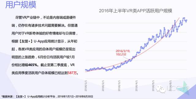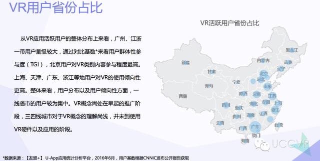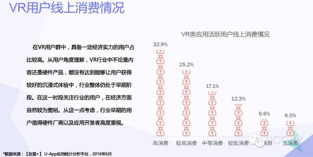 鉴于内容制作成本较高,运行在VR眼镜类设备的应用,绝大多数以视频内容聚合功能为主,由于VR内容与硬件尚处于早期阶段,目前关注VR领域的用户线上消费水平较高,故早期用户的经营对硬件厂商以及应用开发者来讲,都是决定未来VR行业发展的决定性问题。