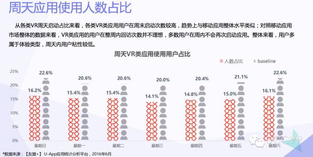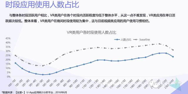 由于非强需求,VR类应用用户周期内使用频次较基础值相比略低,周末、夜间用户使用较为集中,用户使用曲线与视频类APP相仿;但VR类应用用户规模近半年增长迅速,Q2季度VR类应用活跃用户已达587万。