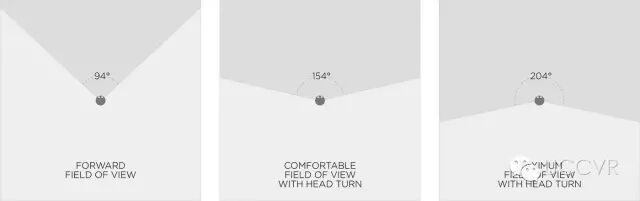 VR头显的默认视野范围大约是94度。保持固定坐姿时,你可以比较舒适的向左右两侧转头30度,最多不超过55度;如果是站姿或坐在转椅上,这两个数字还会有所增长。不过目前,就让我们聚焦在局限性最高的情境当中好了。
