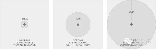 要确保最基本的舒适度,虚拟环境中的目标对象与用户之间的距离不应小于0.5米(Oculus推荐的最小值是0.75米);而10米以上则会使用户的3D深度感知急剧下降;一旦超过20米,目标对象就很难被留意到了。所以我们应该将重要的物体放置在距离用户0.5到10米的范围之间。
