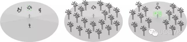 通过用户视野范围界定的故事板主要适用于场景初期的设定,而且用户的视点必须是可预测和可控的。在具备互动性的VR环境中,这一点很容易实现,你通常可以在每个场景开始之初重置用户的视点位置及视线方向。