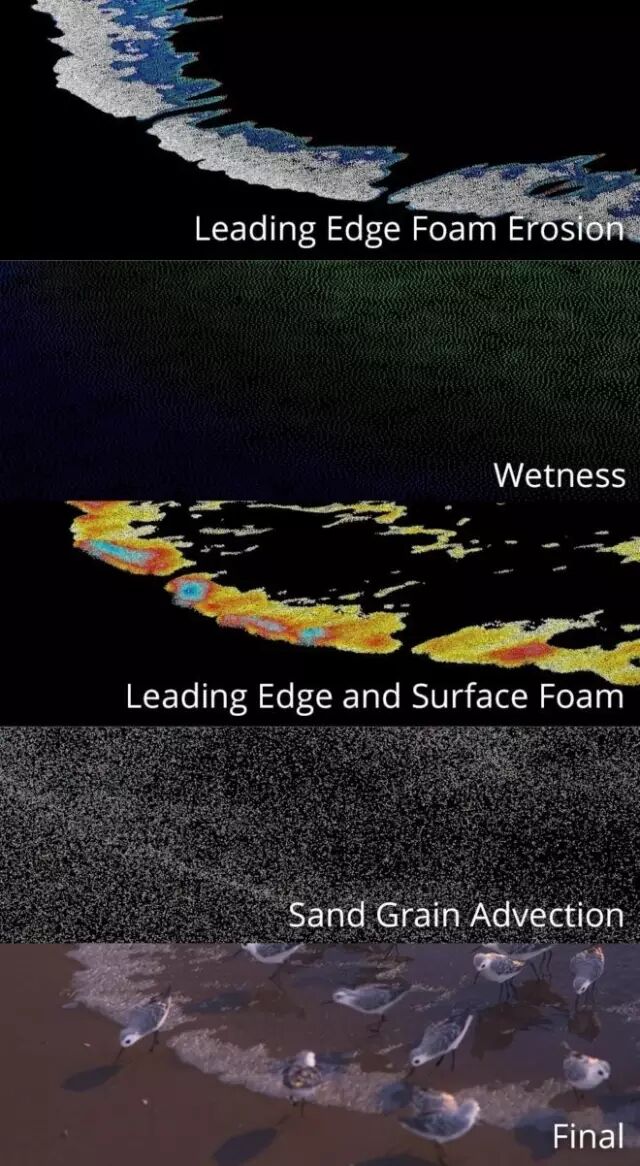 沙子的颜色采用的是阴天环境下沙滩上生成的反照率图,然后利用它制作了很多类型的着色器,包括什么贝壳,石头和折射玻璃。这些颗粒还必须是干湿结合,各式梯度的色彩和明暗度,这样才能模拟出让人信服的无数沙粒。