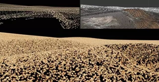 最后,他们想出的结果是:用Mudbox雕刻沙丘,然后在Houdini中用Poisson Distribution在网格上生成沙子。