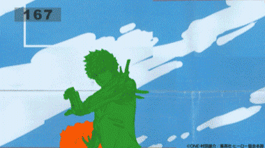 第二集,泽田英彦的作画部分。杰诺斯被蚊女打飞的镜头。这部分是杰诺斯苦战,镜头中的动作包含横纵动作还有翻滚,难度非常高。