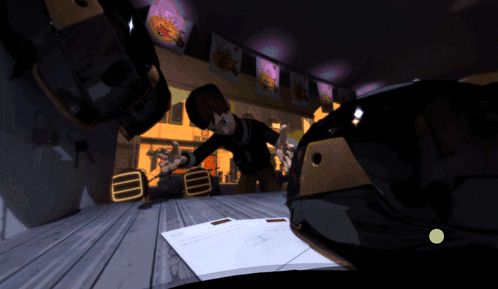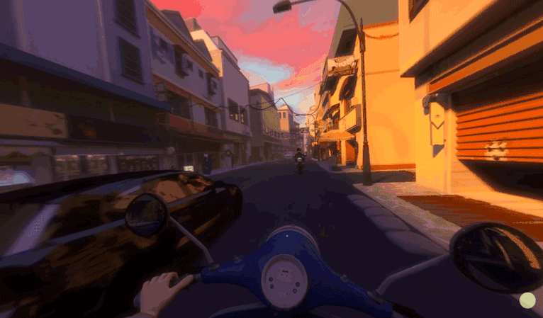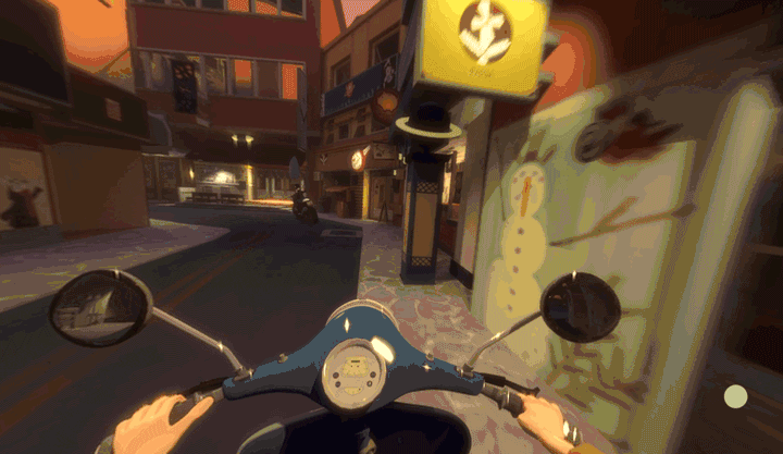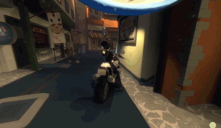 我认为,真正的VR是你在其中,你在里面穿梭,戏剧冲突也就在你身边、身前身后发生,你就在事件其中。所以,这部影片,我尝试让观众成为这个世界里面的一部分,参与其中,让观众走起来,事情就不断地在你身前、身后发生着,在这个故事里,我选择了一个摩托车头盔,作为观众的视角,当主人公戴上头盔,就是“第一人称”主观视角,摘下头盔,观众就是旁观的“第一物称”视角。无论是哪种视角,观众(也就是摄影机主体)都能以某个“合法”的身份,合理存在于这个虚拟世界里。这是恰恰是虚拟现实最有意思的地方。