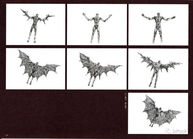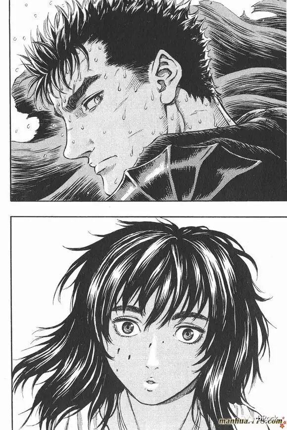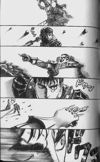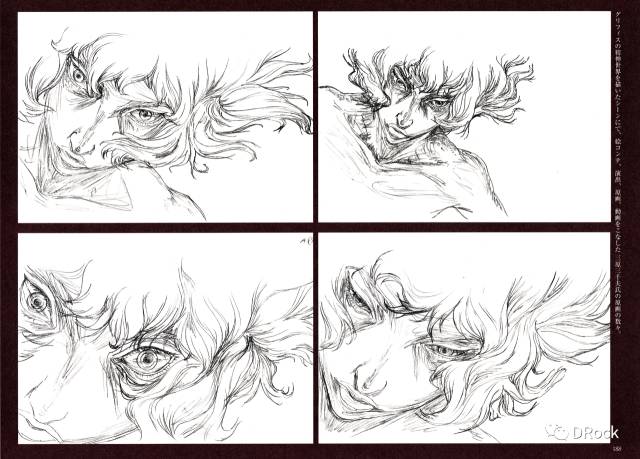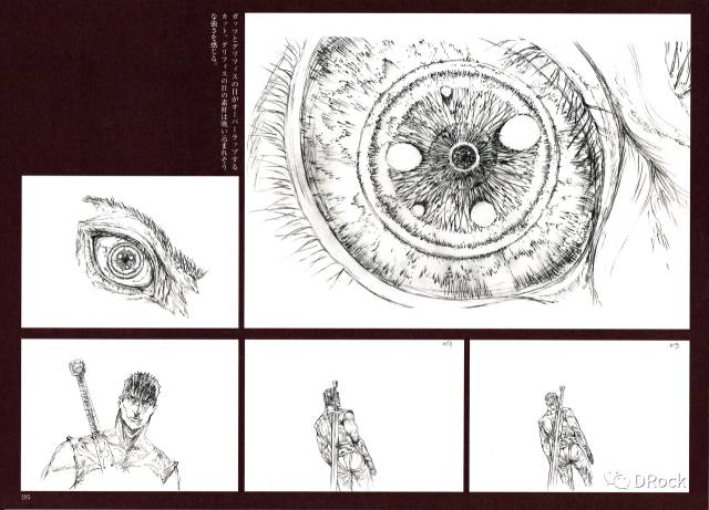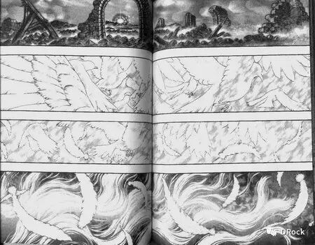 这组分镜表现的是格里菲斯的诞生(此处应有尖叫声),分成两个部分:格斯的7个画面,以及格里菲斯的5个画面。在这组分镜中,三浦运用了多种蒙太奇手法来表现白鹰诞生瞬间的震撼。