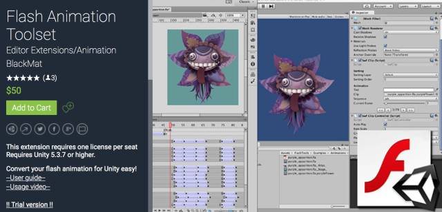 这是一款用于将Flash动画直接导入Unity编辑器的插件,支持Adobe Flash CS6及以上版本导出的Flash动画。Flash Animation Toolset支持包括旋转、扭曲及缩放等各种2D类型的变换,以及关键帧与层的所有补间动画。该插件提供了简单易懂的API,支持在运行时控制动画,还能自动根据动画的不同设置来打包纹理图集。