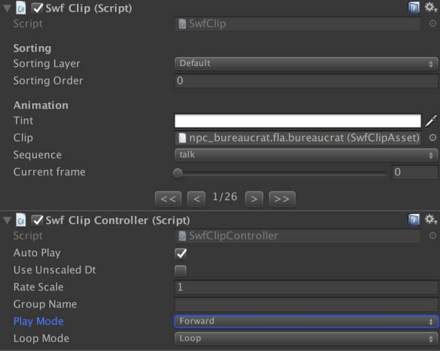 加入场景后即可在检视面板中设置动画的Sorting Layer、播放模式(顺序或倒序)、当前帧及循环模式等等属性。