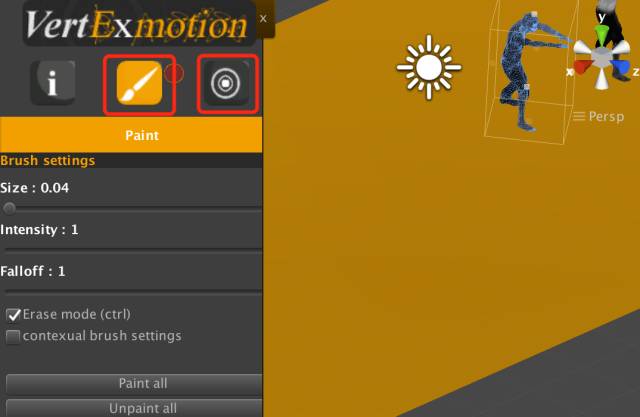 只要为需要动画的角色添加Vert Exmotion脚本,然后利用插件编辑面板中的画刷来“绘制”出角色身上需要进行柔性动画的部位,添加传感器和运动属性即可。