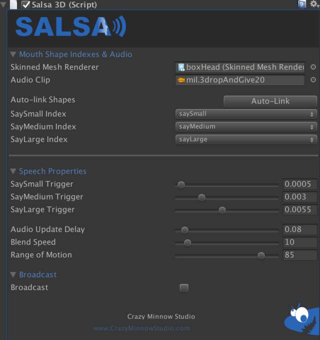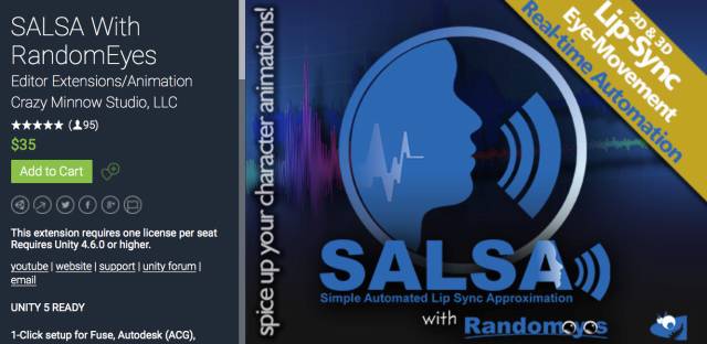 其中SALSA用于让角色唇部动画与实时动作捕捉基本一致,分别使用Sprite及BlendShape数据类型来处理2D角色与3D角色的面部动画。支持实时处理对话的音频文件来自动调整唇部位置,处理效果会比基本的嘴唇张合动画更为出色,且自动化的工作流程无需进行繁复的设置与编辑。