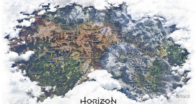 《地平线》的世界位于一片大陆的中心,四周被云雾遮蔽,可探索的区域整体颇似澳大利亚版图,其中有雪山、荒漠、雨林等地貌,地图分为五大区域:Mother`s Heart(母亲之心),Lone Light(孤独之光),Pitch Cliff(至高崖),Meridian(子午线),Sunfall(日落之地),小型地标点一共有17个,之前开放试玩的区域在最东边的Mother`s Heart的一小块区域,可见女主角Aloy将进行一场艰苦的“西游记”。