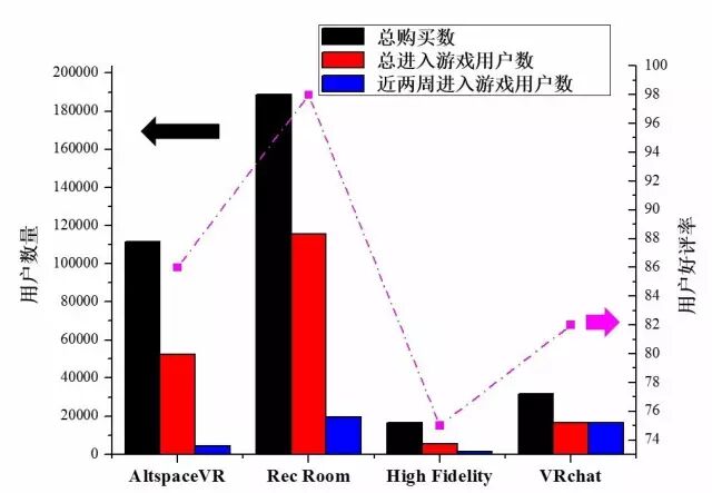 除开主打移动端的vTime和刚发布的F家和T家的产品,剩下的AltspaceVR(上线时间2016/3/31)、Rec Room(上线时间2016/6/28)、High Fidelity(上线时间2016/11/9) 和VRchat(上线时间2017/2/1)都有在SteamVR频道上上线,它们的总游戏购买数量、激活用户数量、近两周活跃用户数量以及用户好评度如下图所示。