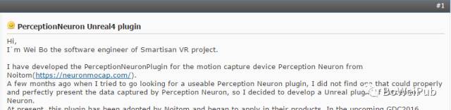 16年3月我在Unreal论坛Development Discussion下的Animation板块发布了题为“PerceptionNeuron Unreal4 plugin”的帖子,正式对外发布了我开发的Perception Neuron Unreal插件。