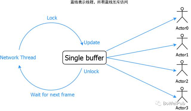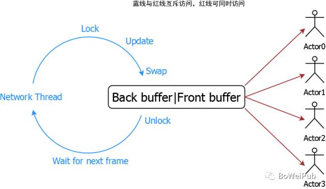 如上图所示,网络线程对Back buffer进行数据更新之后执行swap buffer切换前后台buffer。另外由于使用了多读单写锁,多个角色可以通过动画线程同时对动画数据进行读取并计算新一帧骨骼动画。