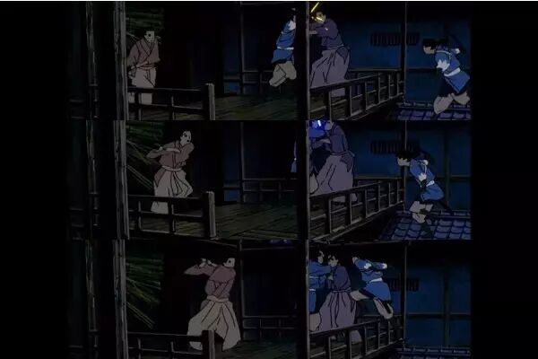 只有松本宪生一个人,靠着自己的时间感觉,在有纸作画的体系中义无反顾地奔向了时间轴系的极端。一拍三作画中的速度与力量学过动画的人应该知道,一拍三的作画方式可以用来处理一些速度较慢、位移较小的动作。而如果是人体的高速运动,则适合使用一拍二或是一拍一的方法。但是,电视动画常常会有张数上的限制。有时候即便是人体的高速运动,也不得不用一拍三去画。这种情况下,用传统动画的套路画出来的人体运动,看上去往往会显得非常奇怪。用一拍三将“高速运动”的印象准确地传达到观众的脑中,在那个年代,几乎是不可能的事情。而将不可能化为可能的男人,就是松本宪生。在《浪客剑心追忆篇》中,有一个冲田总司从房顶跳入走廊的镜头。虽然只有一小段,但却用一拍三的方式顺利地实现了速度感的表现。松本宪生仅用了五张画,就让冲田总司在全景中实现了半个屏幕的位移——中间还有一个跳过走廊围栏的动作。