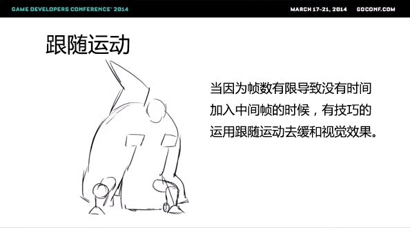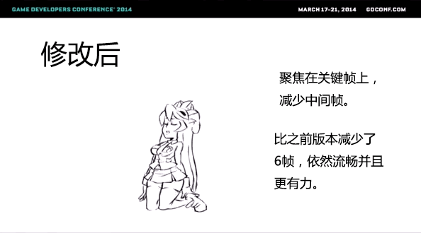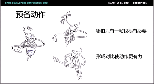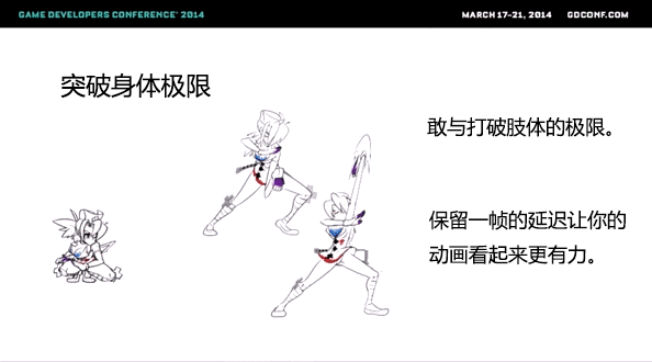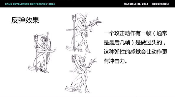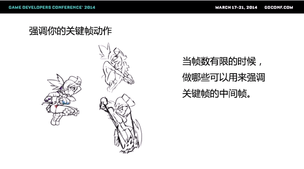 游戏中为了节约内存和保证流畅运行,通常不可以加太多的帧在里面,并且往往有力的动作是不需要太多帧数的。上面的例子中,所有的中间帧都是为了强调这两个关键动作而存在的。