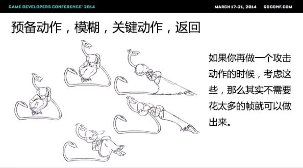 预备动作同样能使人更容易理解动作,知道角色什么时候会出击,并且使动作更有打击感。上面这个例子中的动作只有6帧,在角色身后的龙准备往下攻击的时候,它提前张开了嘴巴,虽然只有一帧,但是使动作更完整了,你虽然看不到这一帧,但你能感觉出来。