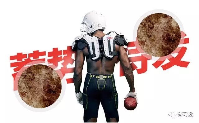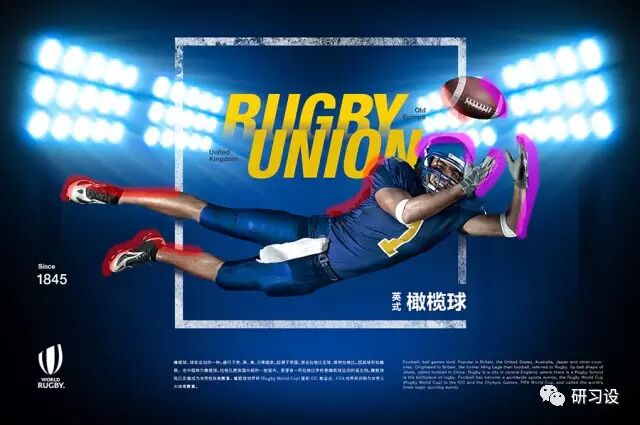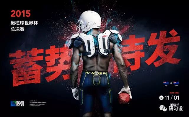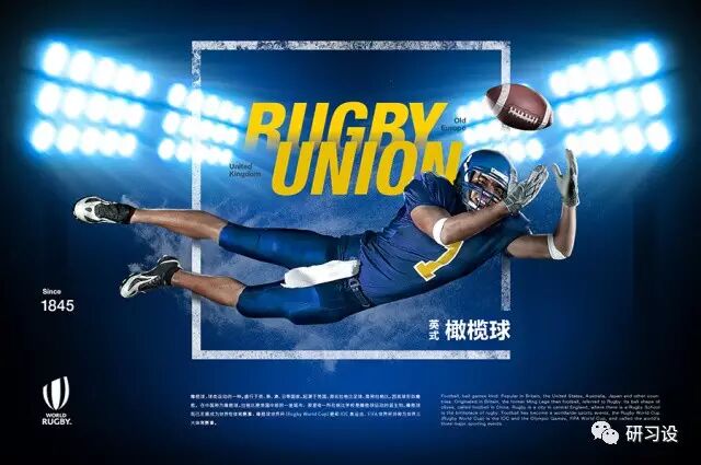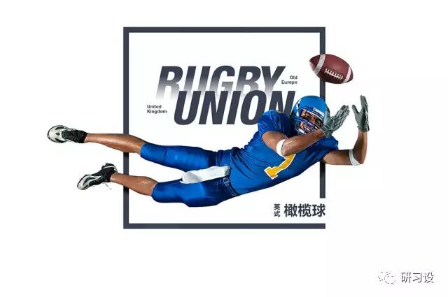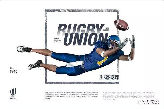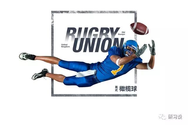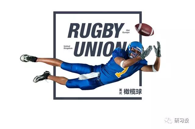 选择橄榄球英文为一级主标题,文字字形选用较粗的无衬线体与黑体搭配,选择具有代入感的图像作为画面主体,与文字叠压处理增强画面层次,同时高跳跃的版面也烘托出比赛热闹的氛围。
