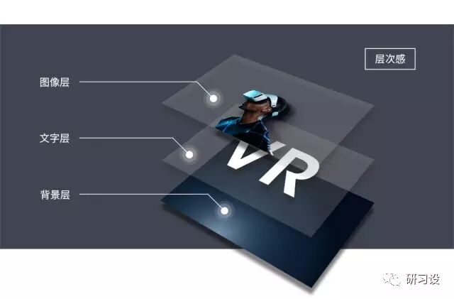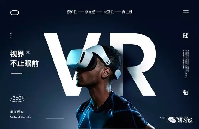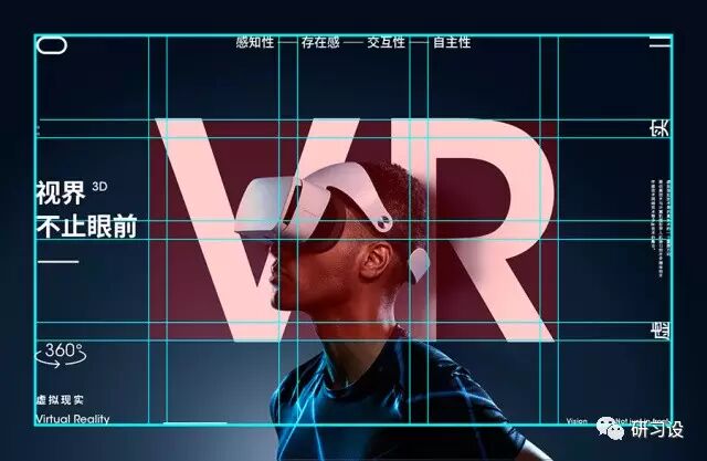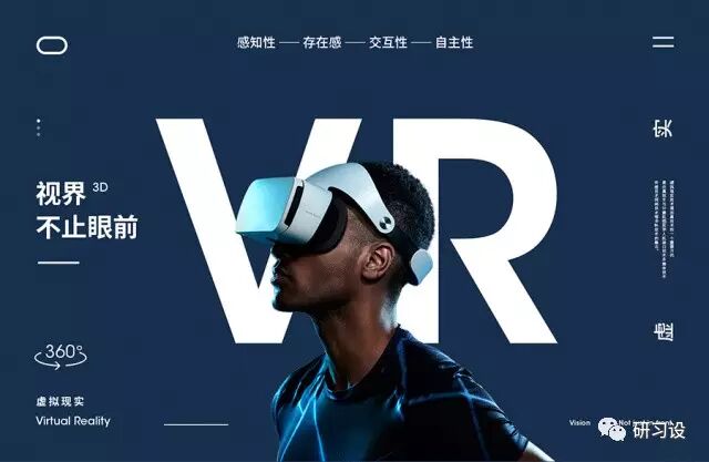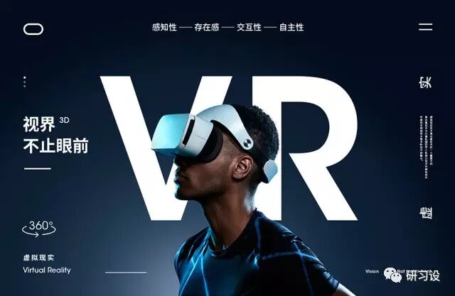 虚拟现实技术Virtual Reality具有很强的科技属性,字形的选择上尽量排除具有装饰性而选择偏抽象和几何化的无衬线体,从文字信息中提取出英文简称VR为画面的一级文字信息,选用在使用和体验状态下的图像为核心画面,文字与退底图像的叠压组合,使画面层次丰富,色彩方面蓝色也具有给人科技感的印象。