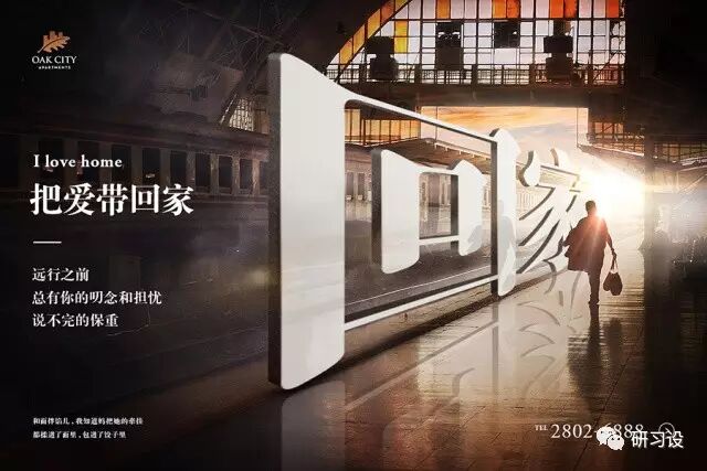 某地产品牌的推广海报,选择车站归乡的画面,暖色系的色调也给人温馨的感受,通过在环境中添加文字,为画面带来较强的视觉冲击力。字形选择宋体与衬线搭配使用。