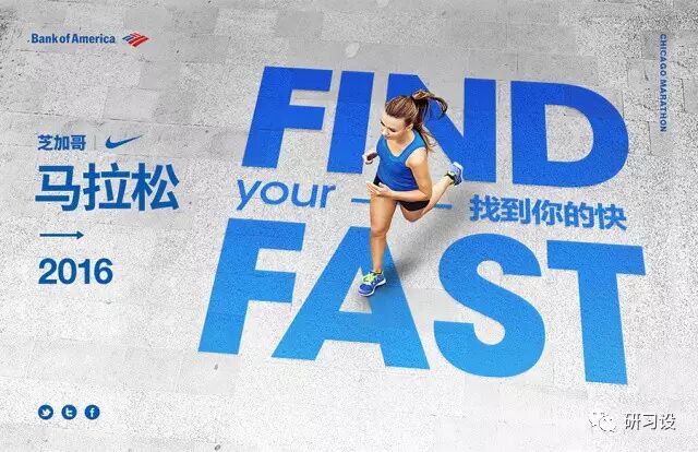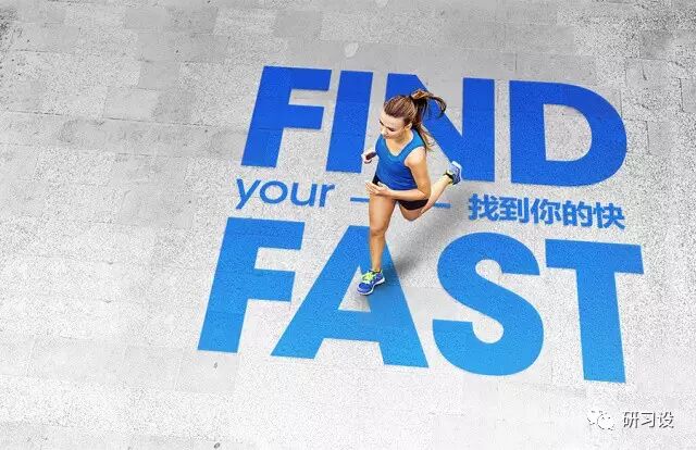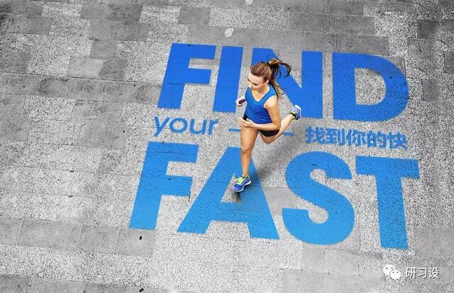 通过特殊视角的图像展现运动员在奔跑时的状态,通过文字元素在空间中的融入,给人趣味性与眼前一亮的感觉。