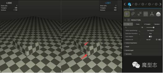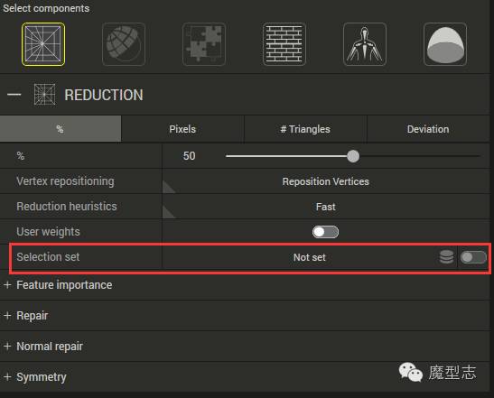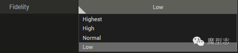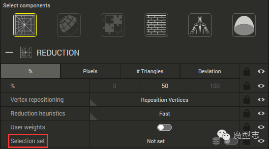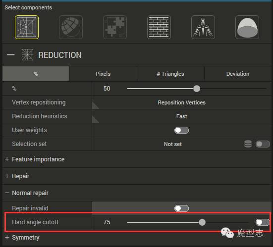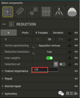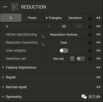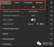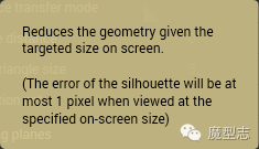 ·减少到原模型的百分比的面数,3个默认档供,中间为数值,前后为默认最小最大值