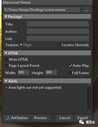我一般就使用默认设置输出,当然你可以把尺寸改成你想要的尺寸,输出完成后你也可以到Artstation发布你的Marmoset view了!