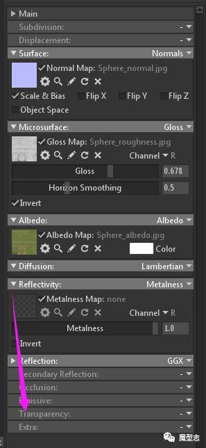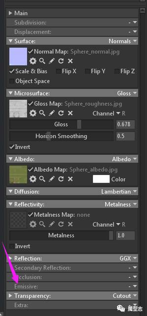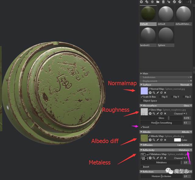 Roughness贴在gloss下边,在预览的时候如果发现错误就把invert反向打开,Metaless贴在Reflectivity下边,但是要不粉色部分的设置从spec改为Metaless。