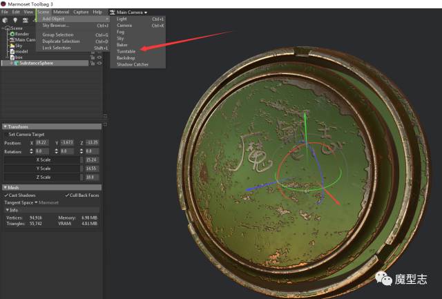 首先选择你要做turntable的物体,点选Scene--Add object--Turntable就完成啦。