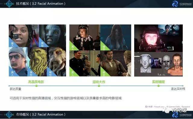 Facial Animation,可以对表情进行精细捕捉,对眼球、口型和下颌的动作细节进行跟踪捕捉,通过深度学习生成表情动画,为VR社交角色拟人化提供可能性,对于虚拟电影、直播得到广泛应用。