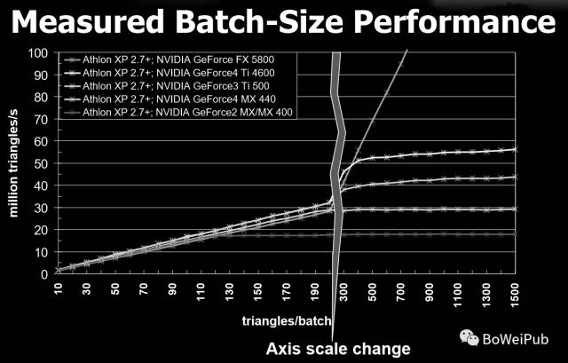 下面的图表出自Nvidia的一次内部分享会的PPT。虽然测试数据使用的硬件配置比较老,但是还是具有很大的参考意义的。表中横轴是Triangles/Batch,表示每一个 Batch中容纳的Triangles数量。纵轴是Million Triangles/s,表示一秒能够绘制的百万级三角形数量。在不同的GPU,相同的CPU的环境下,测试不同大小的Batch所表现出的执行效率的不同。