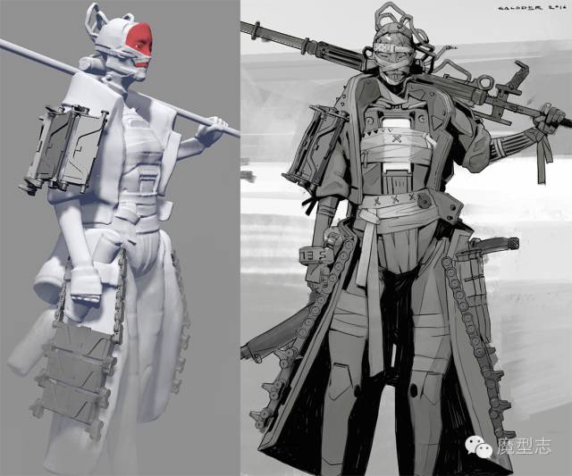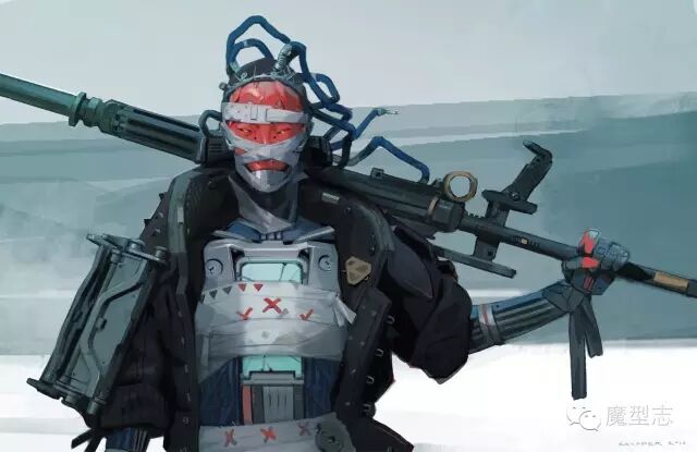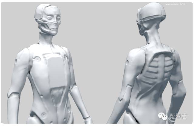 早前的一个想法是应该有一个机械的身体,但仍应参考人类的解剖方式,来创造一个扭曲的简单的形体结构。开始的这个泛泛的想法给与了我很多在细节上以及设计方向的指引,从功能性到装饰性。比如头盖骨的钢材质框架能让人想起人类的大脑,几何模型的切割创建出来的体快能够让你觉得这类似与人类的大脑,暴露部分的胸腔和脊柱就像一个孱弱的病人或被手术解剖惊醒的尸体。