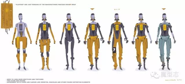 我们需要角色穿着橙色的鉴于制服,但是基于机器人不需要穿着衣服,如果给他们强加上衣服,会让人觉得他们是公共服务型的机器人,所以我们放弃了这个想法。最后我们决定给他们设计一些身体的包装,类似于生产线上给产品一些快速的批量的塑料包装。