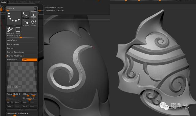 接下来我开始尝试去制作盔甲上的细节,通过的我尝试,我最后需要制作两种花纹。第一个花纹,我自己去创建了一个IMM笔刷,一个类似于三角形的模型笔刷。如果你不是很了解怎么去制作一个IMM笔刷或者IMM笔刷是什么,你们可以通过百度去搜索,或者去zbrush的官方主页去查看他的技术文档,作者也提供了一个官方的视频教学连接:看这里: