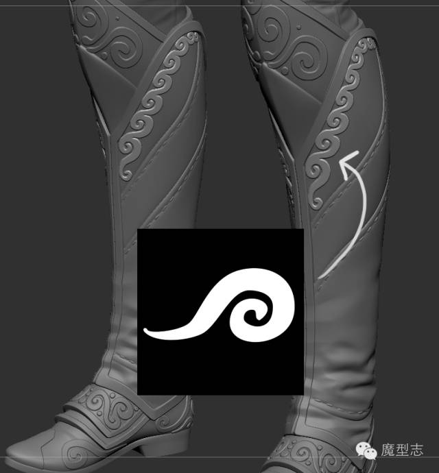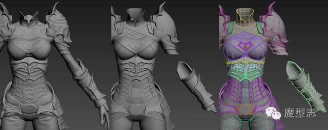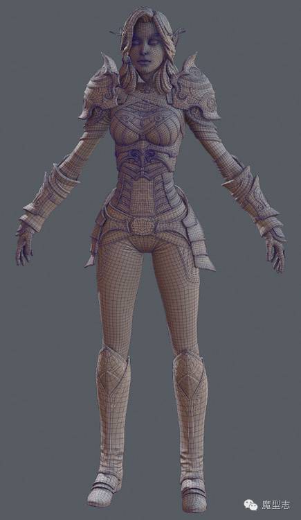 鞋子的花边我使用CurveStrapSnap这个笔刷制作的,但是我对这个笔刷进行的轻微的调整,在Curve-Stroke-Modifier里调整物体边缘的厚度以及衰减,就想调整之前的IMM笔刷一样。当所有的这些细节完成后,我就开始进行拓扑,来创建一个lowpoly mesh。这一次我继续使用Zbrush的ZRemesher来完成,但是Zremesher没办法完成盔甲部分的到脚,所以盔甲部分我会在max里通过建模工具来完成。笔者也放了一个步骤,但是我觉得她没有写清楚这一部分。